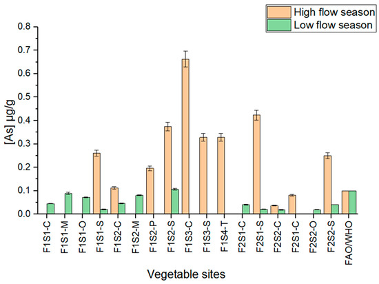 Total concentrations of As in vegetable samples for high- and low-flow seasons.
