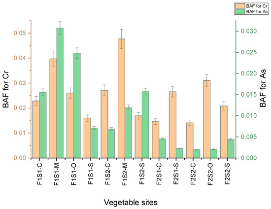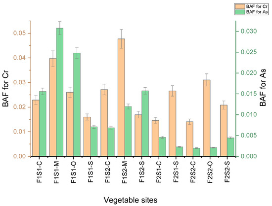 Graphical representation of BAF observed in vegetable samples during high-flow season for Cr and As.