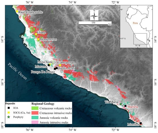 The most significant portion of the PIB is located in the southwest of Peru (Figure 1) and contains diverse types of mineral deposits, including stratabound Fe(-Cu), porphyry Cu(-Au), iron oxide-copper-gold (IOCG), and iron oxide-apatite (IOA) deposits [2,33,35,37,38,39,40,41]. Most of the IOA and IOCG deposits are spatially associated with coeval Mesozoic intrusions [2,37]. Different terms have been used to classify the iron deposits (e.g., Marcona, Pamba de Pongo, Morritos) in this region, such as massive magnetite deposit, skarn, or manto type [2,38]. However, a broader classification categorizes them as Kiruna-type iron-oxide-apatite (IOA) deposits [38]. In comparison with the Chilean Iron Belt (CIB) [2], relatively few IOA deposits have been discovered in the PIB. Nevertheless, IOA-like iron occurrences are intermittently distributed throughout the entire PIB.