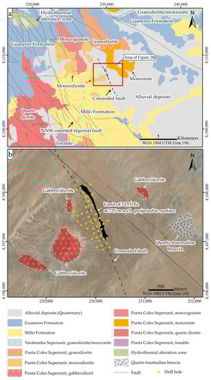 The Mariela deposit is hosted in the intrusions of the Punta Coles Superunit, which is composed of several intrusive bodies with gabbro/diorite, granodiorite, monzodiorite, monzogranite, monzonite, and quartz diorite lithologies (Figure 2a). The mineralization body is covered and concealed by Quaternary deposits (Figure 2a,b). Gabbro-diorite intrusions are the major host rocks of the ore body and have undergone alteration to actinolite, chlorite, and epidote, along with minor amounts of sericite and unspecified clays.