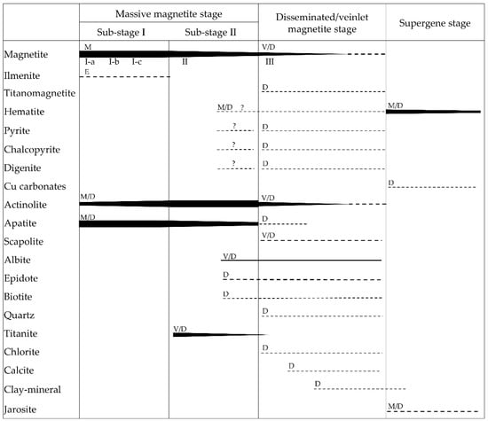 Mineral paragenesis chart for the Mariela deposit. M (massive); D (disseminated); V (veinlets); E (exsolution lamellae); I-a, I-b, I-c, II, and III (types of magnetite). I-a, I-b, and I-c collectively constitute Type I magnetite. The thickness of lines represents the abundance of minerals. Question marks indicate that the presence of the mineral is inferred.