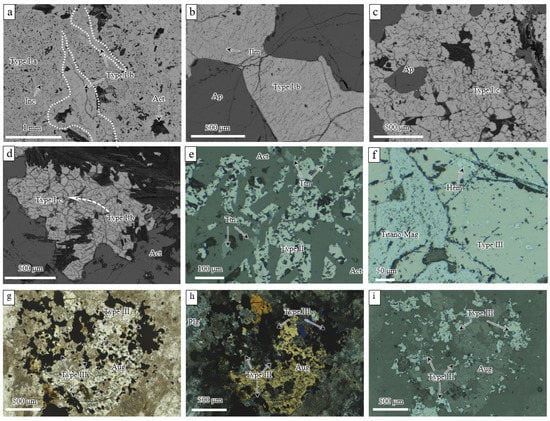 Three main types of magnetite were identified based on spatial location, paragenesis (Figure 3), and typical micro-textures. Type I and Type II magnetite, occurring in high-grade massive magnetite ores, correspond to Sub-stage I and Sub-stage II of the massive magnetite stage, with Type I characterized by a mineral assemblage of magnetite + actinolite + apatite and Type II characterized by a magnetite + actinolite assemblage (Figure 3; Table 1). The Type II magnetite sample has significantly less apatite compared to Type I. According to the microstructure, Type I is further subdivided into three subclasses: Type I-a, I-b, and I-c, as summarized in Table 1. Type I-a magnetite contains abundant mineral inclusions ranging in size from <1 μm to ~35 μm and aligned along magnetite crystallographic planes or randomly distributed (Figure 4a). Some lager inclusions can be recognized as silicate minerals, e.g., actinolite (Figure 4a). Type I-b magnetite is generally inclusion-free with well-developed ilmenite exsolution lamellae (Figure 4b). Type I-c magnetite is inclusion-poor with minor ilmenite exsolution lamellae and displays a mosaic texture, which is characterized by well-defined 120° triple junctions (Figure 4c,d). Type II magnetite, which is associated with abundant actinolite (up to 40 vol.%) and titanite (up to 2 vol.%), is also inclusion-bearing but appears to contain fewer inclusions than Type I-a (Figure 4e). Type III magnetite occurs in relative low-grade ore, is inclusion-poor, and shows minor ilmenite exsolution lamellae (Figure 3 and Figure 4f–i).