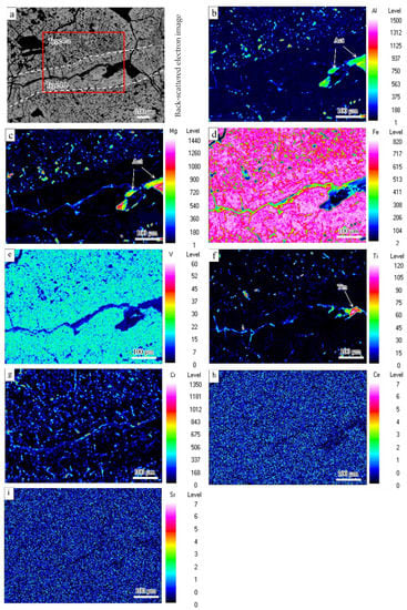 The distribution of Mg, Al, Ce, Sr, Fe, Ti, V, and Cr within selected magnetite grains was determined by making WDS X-ray maps (Figure 5). Type I-a magnetite is slightly more enriched in Fe, Mg, Al, and Cr (Figure 5b–d,g) and has more Mg- and Al-rich mineral inclusions (<10 μm; Figure 5b,c). Type I-b magnetite is distributed on both sides of microfractures and associated with larger Mg- and Al-rich minerals (e.g., actinolite) and Ti-rich minerals (e.g., ilmenite) in the fractures (Figure 5b,c,f). Minerals with high Ti and Cr content and low V content are distributed in a linear and staggered pattern (Figure 5a,f), which may have resulted from the precipitation of ilmenite along the lattice of Type I-b magnetite. Magnesium, Ti, and Cr are relatively enriched in the fractures, where Fe and V are depleted (Figure 5c–g). The distribution patterns of Sr and Ce are not clear due to their low content in the samples analyzed by spectral mapping (Figure 5h,i).