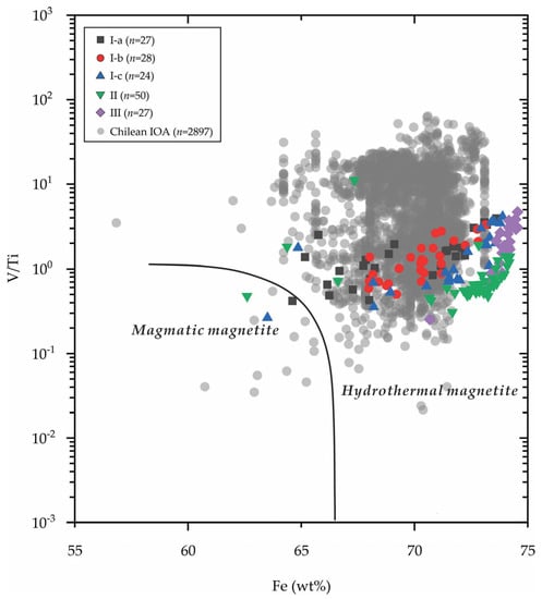 The Fe vs. V/Ti diagram is also used to distinguish between igneous and hydrothermal magnetite [16,18,53]. Magnetite from Mariela mostly plots in the hydrothermal area (Figure 9). The Type III magnetite has a higher V/Ti value than others, and the Type I magnetite (Type I-a, I-b, and I-c) shows a relatively wide range of Fe contents (Figure 9), suggesting a re-equilibration trend, which is supported by the observation of mosaic structure in Type I-c magnetite [16,56,57,58]. The V/Ti ratio for Mariela is relatively stable and close to 1 in comparison to the Chilean IOA deposit (Figure 9).