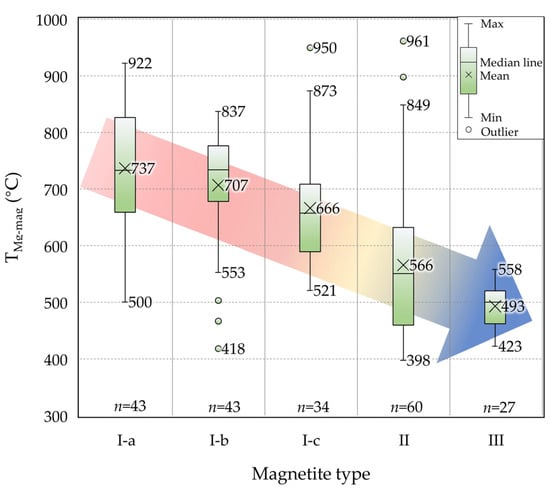 A TMg-Mag thermometer was proposed by Canil and Lacourse [60] as a potential method for qualitatively estimating the crystallization temperature of magnetite at the grain scale using the Mg and Fe concentrations in igneous or hydrothermally altered rocks. TMg-Mag has been calculated using the EPMA and LA-ICP-MS data collected in this study (Supplementary Tables S2 and S3). The statistical results are illustrated in Figure 10. A discernible cooling trend is recognized with successive decreases in temperature from the three subtypes (Type I-a, I-b, and I-c) of Type I magnetite to Type II and Type III magnetite. The highest average TMg-Mag temperatures were calculated in Type I-a magnetite (500–922 °C, avg. 737 °C), followed by Type I-b magnetite (418–837 °C, avg. 707 °C), and Type I-c magnetite (521–950 °C, avg. 666 °C; Figure 10). Type II magnetite forms at a lower temperature (398–961 °C, avg. 566 °C), while Type III magnetite has the lowest average temperature (423–558 °C, avg. 493 °C; Figure 10).