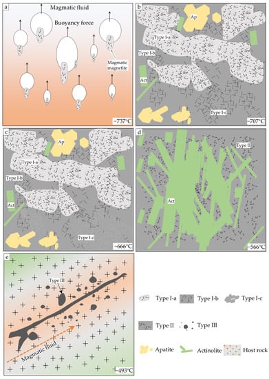 Schematic model for the formation process of magnetite in Mariela. (a) Crystallization of Type I-a inclusion-rich magnetite in magma or magmatic-hydrothermal fluid. (b) Precipitation of inclusion-free Type I-b over Type I-a magnetite. (c) Formation of Type I-c magnetite through re-equilibration of Type I-b magnetite. (d) Precipitation of Type II magnetite with abundant actinolite. (e) Formation of late veinlets and disseminated magnetite (Type III).
