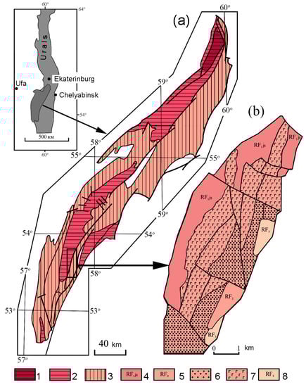 (a) Geological scheme of the Bashkirian Anticlinorium. (b) Geological map of the Shatak Complex. 1—Archean–Paleoproterozoic sediments not dissected; 2—Lower Riphean sediments; 3—Middle Riphean sediments; 4—Jusha Formation; 5—non–dissected deposits of the Zigazino–Komarovsk and Avzyan Formations; 6—Zigalga Formation; 7—Mashak Formation; and 8—Upper Riphean.