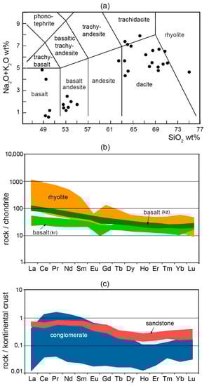 The diverse chemical composition of the rocks of the Shatak Complex varies from alkaline varieties (trachybasalts and trachydacites) to low-alkaline picrobasalts, basalts, and rhyolites (Figure 2a).