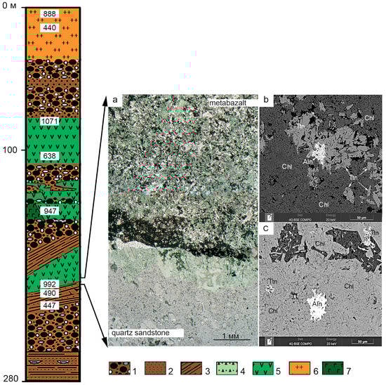 (a) Section of the Kuz’elga sub-formation showing the contact zone between the metabasalts and the quartz sandstones, along with micrographs. (b) Mineral composition of the contact zone. (c) Mineral composition of the contact zone. The numbers on the diagram indicate the fluorine content (ppm). 1—conglomerates; 2—sandstones; 3—shales; 4—tuffs, tuff sandstones; 5—metabasalts; 6—rhyolites; and 7—dolerites. Aln—allanite; Chl—chlorite; and Ttn—titanite.