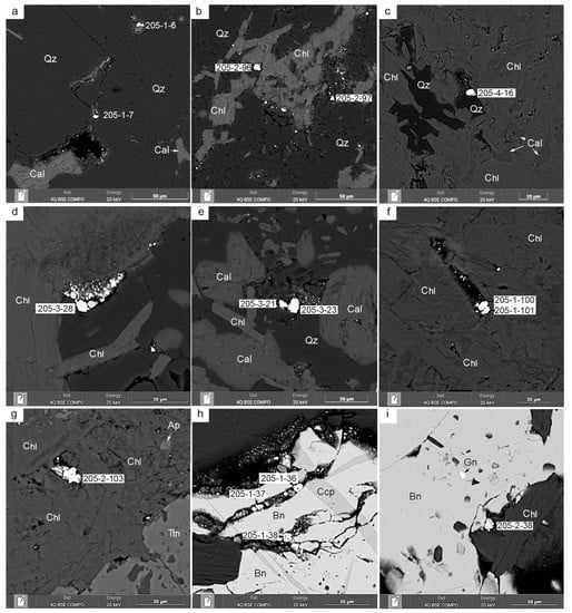 Microphotographs of oxyfluorides (a–i) in the rocks of the Shatak Formation. The numbers shown on the microphotographs correspond to the analysis numbers in Table 1. The abbreviations used are as follows: Chl—chlorite; Cal—calcite; Ttn—titanite; Ap—apatite; Qz—quartz; Bn—bornite; Ccp—chalcopyrite; and Gn—galena.