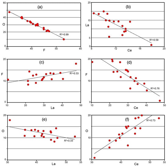 The analysis of a series of binary phase diagrams (Figure 5) revealed the interrelation between the main elements in the chemical composition of the detected oxyfluorides. A nearly ideal inverse dependence, having a coefficient of determination of R2 = 0.99 (the coefficient of determination is defined as a statistical measure that indicates the proportion of the variance in the dependent variable that can be explained by the independent variable(s) in a regression analysis) was observed between oxygen and fluorine. This characterizes the “oxidation” process of fluocerite-(La) (analysis No. 205_1_37, Table 1), progressing through intermediate compounds such as (La, Ce)OF, and ultimately leading to the formation of La–Ce oxide (analysis No. 205_1_84, Table 1). The isomorphism between oxygen and fluorine was demonstrated by the inverse relationship between La and Ce, having a determination coefficient R2 = 0.59 (Figure 5). Additionally, the O–Ce–F plots display a direct relationship between oxygen and cerium, having a determination coefficient R2 = 0.73, and an inverse relationship between fluorine and cerium, having a determination coefficient R2 = 0.76. However, no significant correlations were observed between O–La–F (determination coefficient R2 = 0.33). Therefore, in the process of oxyfluoride formation, the strongest interrelation occurred between oxygen, fluorine, and cerium, while the behavior of lanthanum was typically unsystematic.