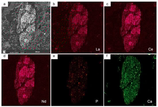 Microphotograph of a shale clast showing pseudomorphic substitution by an assemblage of rare-earth elements, as well as allanite and fluorapatite (a–f).