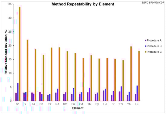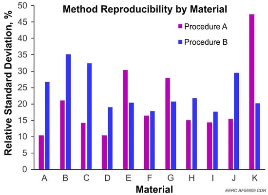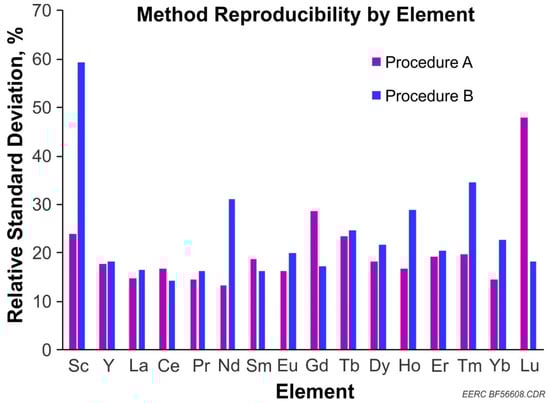 The materials that showed the greatest RSDs for reproducibility appear to be Material B (bituminous coal) and Material K (mine waste material), with RSD values > 35% for one or the other of Procedures A and B. Several other materials were close to 30% RSD with respect to reproducibility. Again, the higher RSD of Material B could be explained by the low concentrations of all elements found in that material. Although Material K had much higher concentrations of REEs, that particular matrix was possibly more challenging to analyze for the three methods.