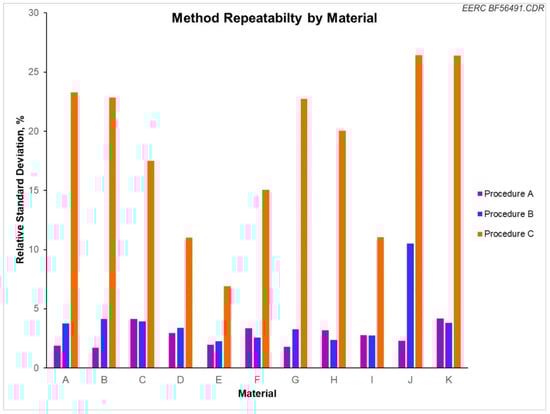 The mean repeatability (within-laboratory) relative standard deviations for Procedures A, B, and C are summarized and compared in Table 4 and Figure 1 and Figure 2.