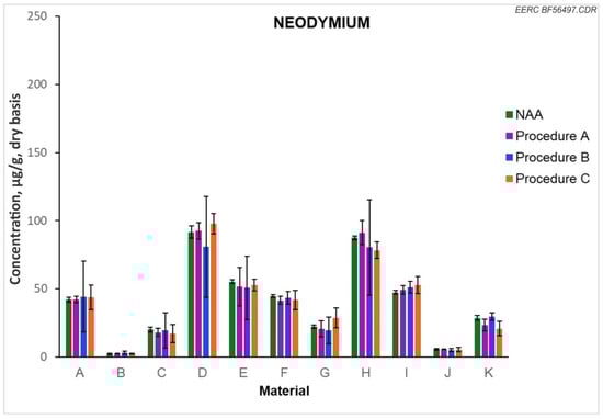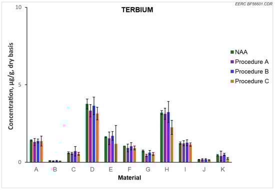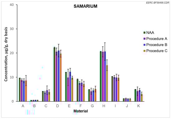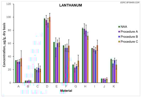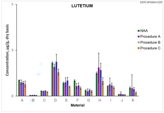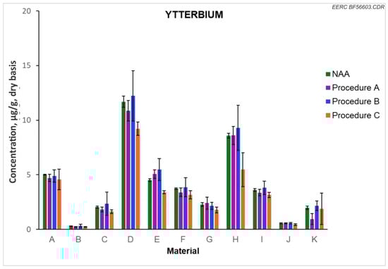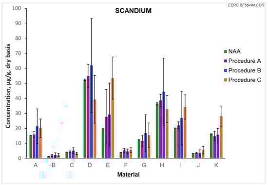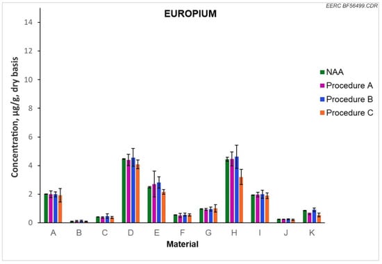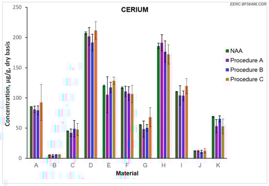Figure 5, Figure 6, Figure 7, Figure 8, Figure 9, Figure 10, Figure 11, Figure 12, Figure 13 and Figure 14 show the mean concentrations and standard deviations obtained from the four procedures for each of the eleven materials. The standard deviations were calculated from the following number of observations (i.e., test results): NAA (n = 3), Procedure A (n = 21), Procedure B (n = 15), and Procedure C (n = 3). Each element is presented in a separate figure.