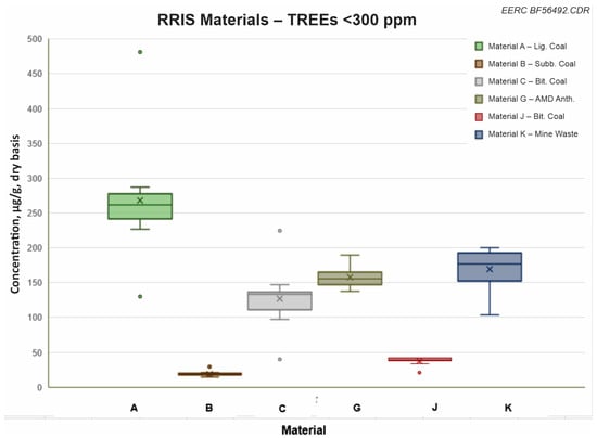 These data show that the reported TREE results for several of the materials analyzed varied significantly, as can be seen from the large range between the minimum and maximum values. Of particular interest are Materials F and I, where the mean values are close to 300 ppm (272 and 313, respectively); in both cases, the minimum values were much less than 300 ppm and the maximum values were much higher. This is a significant difference when qualifying resources based solely on a >300 ppm TREE content.