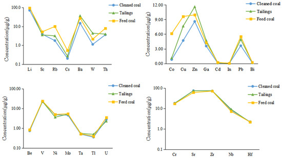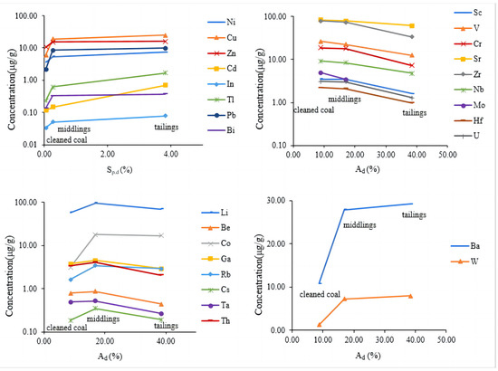 The distribution of the lithophile elements Li, Be, Co, Ga, Rb, Cs, Ta, and Th were irregular in cleaned coal, middlings, and tailings. Therefore, they cannot be closely correlated with the ash yield, in which Al2O3 and SiO2 represent the main components. This suggests that these elements may be uniformly distributed in clay minerals and organic associations. Additionally, trace elements may occur in fine-grained mineral inclusions found in the molecular voids of coal [41], which were difficult to remove during the coal gravity separation. The concentrations of Ba and W found in different coal preparation products increased with their corresponding Ad. This indicates that these two elements were mainly associated with minerals.