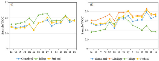 Distribution patterns of REY in different coal preparation methods. (a) Flotation; (b) gravity separation). Normalized to average REY concentrations in UCC [45].