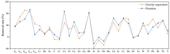 The removal rate of several lithophile elements (Sc, Rb, Cs, Th) through both gravity separation and flotation showed no significant difference (<10%). However, the removal rate of Be, V, Zn, Ga, Mo, Ta, and U through the coal preparation using both methods was low (<25%). This may be due to fact that these elements were mainly bound to organic matter, with only a small amount associated with minerals. Tantalum might be adsorbed by the organic matter under the action of a hydrothermal solution [44], resulting in a low removal rate.