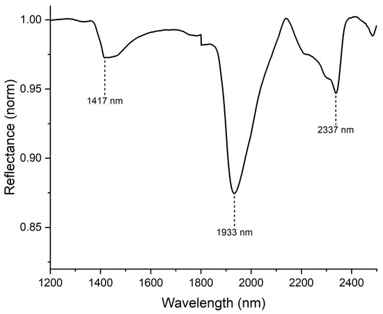 The resulting SWIR reflectance spectra (Figure 5) of the pastes show features at around 1420 nm and 1925 nm and bands between 2200 nm–2332 nm, all of which are related with a smectite group clays. Spectral bands near 1420 nm are related to OH groups, while those around 1925 nm are related to interlaminar water in the clay structure. The interval between 2200 nm–2332 nm indicates the presence of Al-OH (2200 nm), Mg-OH (2332 nm), or Fe-OH (around 2260 nm) groups associated with laminar silicates from the smectite group, such as montmorillonite, nontronite, or saponite, as described in previous works [25,26,27,28]. It is evident that the spectrum associated with object 97-020 exhibits a distinct difference. Notably, it displays a stronger signal correlated to the Al-OH group, which aligns with the findings from XRF analysis.