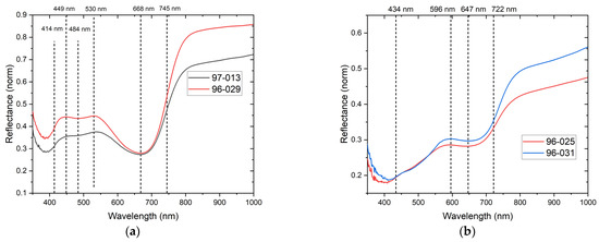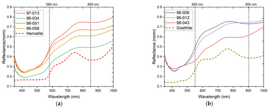 (a) Red, orange, and (b) yellow example reflectance spectra with principal features indicated and comparison with reference spectra for hematite and goethite according to [28].