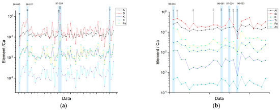 From the data, it is possible to establish an average elemental composition; most of the objects fall within this average and correspond with Chen Mul modeled censers from the Postclassic period (1150–1450 A.D.), which are linked to a local manufacturer as described by Peraza Lope [12]. Some objects that deviate from the average composition (Figure 3) can be observed, for example, results from pieces such as 97-020 (Figure 4b) that show a significantly higher concentration of elements like Si, Al, Fe, Ti, and Sr relative to Ca, while 97-070 presents a higher content of Fe and Ti. These objects are attributed to an earlier archaeological context (~1100 A.D.), and their manufacture style suggests an origin on the east coast region, as described in the works of Milbrath et al. and Peraza Lope et al. [9,10,11,12,13,14].