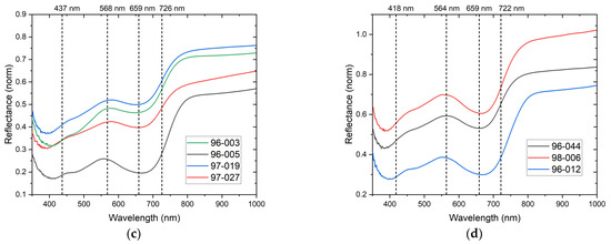 Representative reflectance spectra from (a) blue regions and (b–d) green regions.