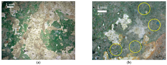 (a) Uniform green layer over stucco at 40× corresponding to green 1, and (b) green region with yellow pigment layer and blue particles (position indicated with yellow circles) at 50×, corresponding to green 2.