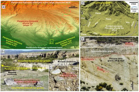 Onshore alluvial fans in the Otago foreland basin complex [25]. (a) Oblique digital topography of a large Pleistocene fan emanating from a rising antiformal range (vertical scale exaggerated ×2 for clarity). (b) Distal portion of fan in (a), showing unconformity between fan gravels and underlying Miocene sediments, exposed by placer gold miners following an erosion channel. Numerous large boulders of silica-cemented Miocene quartz pebble conglomerates litter the exposed unconformity. (c) Typical fan gravels in (a,b), showing abundant lithic sediments (brown) and recycled Miocene quartz pebble conglomerates (white). (d) Oblique digital topography of an inland basin margin, showing remnants of a large Pliocene alluvial fan (Plio) that has been eroded and recycled into Pleistocene fluvial deposits (Pleist). (e) Unconformity between deformed, tilted and eroded Pliocene distal fan sediments (below; fan as in (d)) and Pleistocene lithic sediments (above), in an outcrop exposed by down-cutting of a Holocene river.