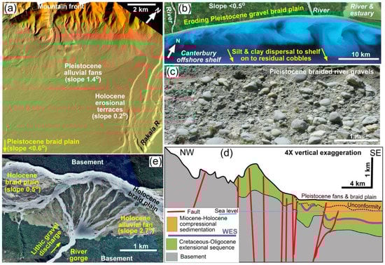 Onshore alluvial fans and associated braid plains in the Canterbury foreland basin. (a) Digital topography (exaggerated vertical scale) of the mountain front of the main Canterbury foreland basin, with typical fluvial slope angles of Pleistocene surfaces and terraces of a major Holocene river (right) that has a braid plain on the floor of a broad erosional channel cut >100 m into older gravels. (b) Aerial view (from Google Earth) of coastline at foot of the braid plain, with active plumes of fine sediments extending offshore onto the Holocene shelf unconformity that is transgressing coastwards (Figure 3a). (c) Typical braid channel gravels, with coarse rounded lithic cobbles in a matrix of lithic sand and silt. (d) Sketch cross-section, modified from [18], through the mountain front to the edge of the plains (as in (b)), with deformed Pleistocene gravels resting unconformably on deformed older basin sequence. (e) Aerial view (from Google Earth) of an active Holocene alluvial fan, with white active braid channels, extending from a steep side-stream into an active braid plain in an axial river in a glaciated inland valley.