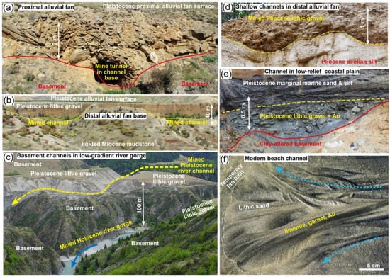 The onshore fluvial placer gold concentrations are focused in erosion channels within the fluvial sequences, from the Cretaceous to Holocene (Figure 8b and Figure 10). Alluvial fans and downstream rivers that flow on the basement are the most significant sites for placer gold accumulation (Figure 7c, Figure 8a,b and Figure 10). Mining typically focused on the lowest part of the erosion channels (the thalweg), where coarse gravel hosted heavy mineral concentrations with gold (Figure 10a,b), and gold concentrations declined rapidly away from the thalweg both laterally and vertically. Likewise, other heavy minerals were not concentrated at shallower levels within these channels and on the channel margins, and any heavy minerals have been substantially diluted by silicate gravel and sand and/or a silt matrix. This is particularly true in relatively young (Pliocene–Holocene) sediments that are dominated by lithic debris. These essentially barren gravels were removed in mining merely to provide access to the thalweg material below (Figure 10c). Channels were unconformably incised into the underlying basement (Figure 10a,c) or soft sediment (Figure 8b and Figure 10b,d) on scales from centimetres to tens of metres. In low-relief coastal environments, the channels are smaller and shallower, but heavy mineral concentrations are still preferentially found in the thalweg (Figure 10e), even if only a few cm deep (Figure 10f).