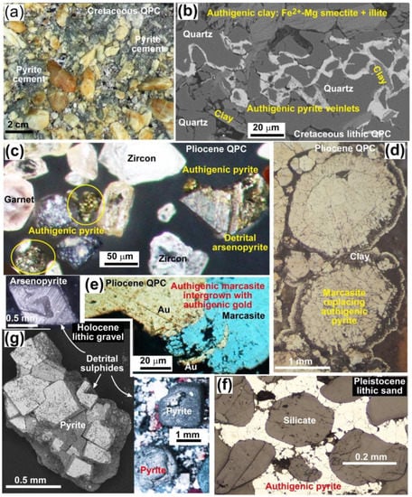 Principal textures of sulphide minerals in Cretaceous–Holocene terrestrial sediments [24,27,30,31] (a) Authigenic pyrite cement (grey) in Cretaceous quartz pebble conglomerate (QPC) overlying an internal unconformity on a coal seam. (b) Authigenic pyrite veinlets (light grey) form a network through groundwater-altered Cretaceous lithic quartz pebble conglomerates, with associate ferrous iron-bearing authigenic clays. (c) Disaggregated Pliocene quartz pebble conglomerates heavy mineral fraction, with fragments of authigenic pyrite and a particle of detrital arsenopyrite. (d) Authigenic pyrite grown in interstices of a Pliocene QPC and transformed into authigenic marcasite. Authigenic clay coating has been overgrown by marcasite in places. Polished section with partially crossed polars to enhance internal structure. (e) Intergrown authigenic gold and marcasite in Pliocene quartz pebble conglomerates. Marcasite has blue tinge because of carbon coat for electron microscopy. (f) Crystalline authigenic pyrite cement in Pleistocene lithic sand. (g) Detrital sulphides from Holocene lithic gravel near an exposed orogenic deposit [73,78]: partially rounded arsenopyrite (top), coarse angular pyrite (left), and rounded pyrite (lower right).