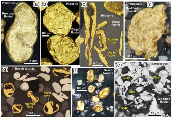 Typical morphological features of detrital gold in the southern South Island: (a–e) in inland Otago basin complex [27,28,29,31]; (f,g) at the margin of the Waiau basin [30]. (a) Proximal coarse particle derived from a supergene enrichment zone in Mesozoic schist and recycled through Miocene quartz pebble conglomerates into lithic Pleistocene gravels. (b) Distal thin fluvial flakes with folded rims from Pliocene quartz pebble conglomerates, recycled from Miocene quartz pebble conglomerates. (c) Sections through distal flakes (etched to show internal structure) that were recycled from Miocene quartz pebble conglomerates into Pleistocene lithic gravels. (d) Cretaceous fluvial flake with rough surface formed by authigenic gold remobilisation. (e) SEM image of complex plates of authigenic gold (white) that has overgrown authigenic clay on the exterior surface of Cretaceous fluvial gold. (f) Toroidal and spheroidal gold formed by sand blasting of fluvial flakes on Pleistocene–Holocene beaches. (g) Section through beach gold as in (f), accompanied by detrital platinum (white).