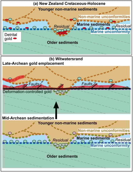 Possible young analogues for regionally extensive unconformities (100 to 400 km2) in the gold-bearing Witwatersrand Supergroup (Archean, South Africa) occur in the South Island of New Zealand. Extensive marine unconformities in New Zealand show progression from an unconformity surface to conglomerate to clean well-sorted sandstone to marine mudstone, as is also found in the major Witwatersrand auriferous reef horizons. The hosting young sedimentary basins of the South Island rest on thin or thick crust on inboard and outboard foreland settings, with variable alluvial gold budgets. They expose the Cretaceous–Oligocene Waipounamu Erosion Surface unconformity that formed when most of New Zealand was subsiding, and Pleistocene–Holocene unconformities related to global sea level changes. The Witwatersrand gold-bearing reef sediments are a good match for such marine transgressions, but not alluvial fans or braided streams. Most Witwatersrand gold is immediately above planar unconformity surfaces and not restricted to, or concentrated in, erosion channels that are incised through the reefs. However, in modern alluvial fans or braided streams, gold is almost entirely in erosion channels on a smaller scale than the Witwatersrand gold reef packages and not spread across the planar unconformities. Alluvial fans and braid plains in New Zealand dilute gold with large volumes of gravel.