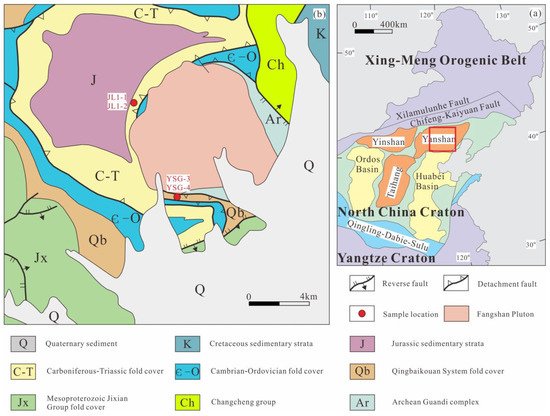Samples YSG-3 and YSG-4 were collected from the Guandi-Yangshigou area in the south of the Fangshan pluton (Figure 2a), located at the boundary between the Middle Proterozoic Jixian Tieling formation and the Neoproterozoic Xiamaling formation. Samples YSG-3 and YSG-4 were collected from the Neoproterozoic Xiamaling formation. Most of the contact thermal metamorphic rocks have developed foliation structures.