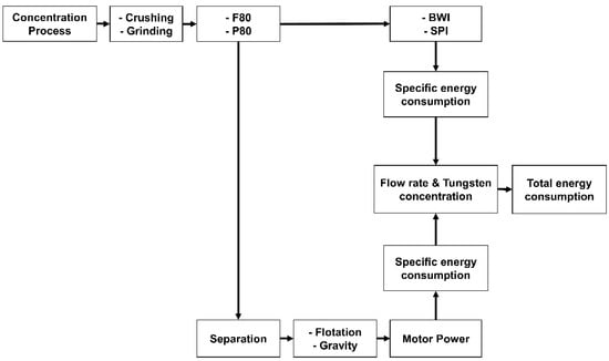 The methodology to determine the energy consumption in this study is summarized in Figure 1, which includes comminution stage and separation stage. The comminution was assembled into two processes, crushing and grinding. The crushing is normally carried out in a primary crusher and secondary crusher; however, only one crusher can be applied in the case of tungsten ore, and it can be selected between using Jaw crusher or Cone crusher. Similarly, the grinding is achieved by either a semi-autogenous (SAG) mill or a ball mill. Further separation after comminution was obtained by gravity or flotation. The energy estimation was conducted based on a literature review of copper concentration processes due to a lack of information on the tungsten process in Mongolia. However, the input data considering the operating process of tungsten ore was employed since the particle sizes of grinding products and the feeding of raw materials are different. The particle size of the comminution process referring to the tungsten concentration process is given in Table 1.