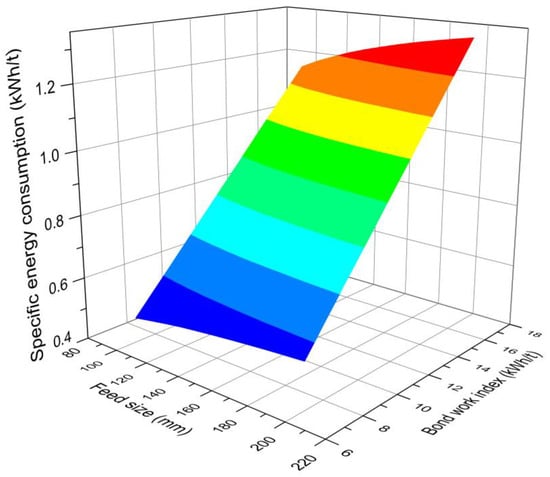 Prediction of specific energy consumption of crusher with variation in Bond work index (1 to 17) and the feed size (100 to 200 mm).