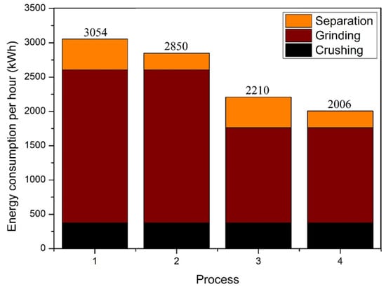The maximum energy consumption per hour for the total process considering different equipment. (Process 1: cone crusher + SAG mill + flotation; Process 2: cone crusher + SAG mill + shaking table; Process 3: cone crusher + ball mill + flotation; Process 4: cone crusher + ball mill + shaking table).