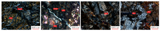 Microscopic images of the ophiolitic mélange. (a) Dunite orthogonal photomicrograph. (b) Wehrlite orthogonal photomicrograph. (c) Anorthosite orthogonal photomicrograph. (d) Gabbro orthogonal photomicrograph. Ol = olivine; Serp = serpentine; Px = pyroxene; Pl = plagioclase.
