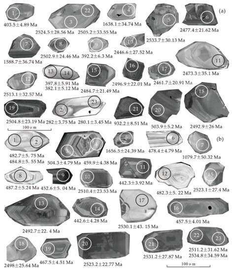 - Rubatto, D.; Gebauer, D. Use of cathodoluminescence for U-Pb zircon dating by ion microprobe: Some examples from the Western Alps. In Cathodoluminescence in Geosciences; Springer: Berlin/Heidelberg, Germany, 2000; pp. 373–400. [Google Scholar]
