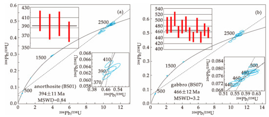 Concordance and weighted mean age plots (a,b) of LA-ICP-MS zircon U-Pb ages for Shazouquan mafic rocks in the BOB. (a) Anorthosite (BS01). (b) Gabbro (BS07).