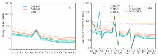 (a) Chondrite-normalized REE patterns. (b) Primitive mantle-normalized incompatible element distribution patterns for Shazouquan mafic rocks in the BOB (chondrite data and primitive mantle data for normalization taken from Sun et al. [54].