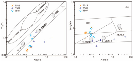 Plots of Nb/Yb-Th/Yb (a) and Nb/Yb-TiO2/Yb (b) in Shazouquan mafic rocks in the BOB [54]. MORB stands for mid-ocean ridge basalts; N-MORB stands for normal MORB; E-MORB stands for enriched MORB; OIB stands for ocean island basalts.