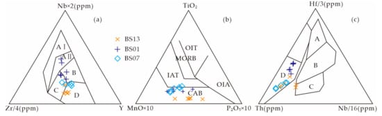 Plots of Shazouquan anorthosite and gabbro Nb × 2-Zr/4-Y (a) [70], TiO2-MnO × 10-P2O5 × 10 (b) [71], and Hf/3-Th-Nb/16 (c) [72] in the BOB. Nb × 2-Zr/4-Y diagram: AI stands for within-plate alkaline basalts, AII stands for within-plate alkaline basalts and within-plate tholeiitic, B stands for E-MORB, C stands for within-plate tholeiitic and volcanic-arc basalts, and D stands for depleted MORB and volcanic-arc basalts. TiO2-MnO × 10-P2O5 × 10 diagram: OIT stands for ocean island tholeiitic, MORB stands for mid-ocean ridge basalts, IAT stands for island-arc tholeiitic, OIA stands for ocean island alkaline, and CAB stands for calc-alkaline basalts. Hf/3-Th-Nb/16 diagram: A stands for depleted MORB, B stands for E-MORB and within-plate tholeiitic, C stands for within-plate tholeiitic, and D stands for volcanic-arc basalts.