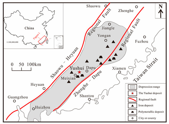 Schematic map of regional tectonics showing the location of the Yushui deposit in eastern Guangdong Province (modified after Ref. [20]).