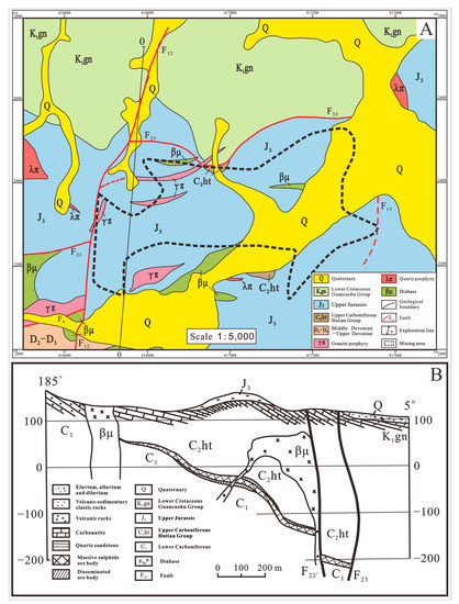 (A) Regional stratigraphy of the Yushui mining district (modified after Ref. [20], data sources from No. 723 Geological Prospecting Team and the local mining company). Note that the deeply concealed ore bodies are hosted in the sedimentary strata of Upper Carboniferous Hutian Group and Lower Carboniferous Zhongxin Formation; (B) Geological profiles of the Yushui deposit cross-section of ore-bearing sector along No. 0 exploratory line (modified after Ref. [28]).