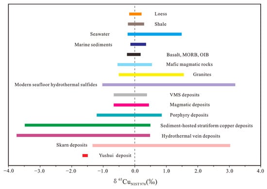 The copper isotopic compositions of basic-ultrabasic rocks have relatively homogeneous Cu isotope compositions, and the δ65Cu values are close to 0‰ [1,37,100,101,102], while the granite shows slightly large variations in Cu isotope compositions, with δ65Cu values ranging from −0.46‰ to 1.51‰ [103]. The δ65Cu values of loess and shale range from −0.13‰~0.17‰ and −0.17‰~0.25‰, respectively [1,103,104,105]. There is a significant difference in the Cu isotopic compositions among copper-bearing minerals from different types of primary deposits (Figure 5), with −0.62‰~+0.40‰ for magmatic deposits [100,101,106], −1.29‰~+2.98‰ for skarn deposits [82,106,107], −0.62‰~+0.34‰ for volcanogenic massive sulfide (VMS) deposits [6,108], −3.70‰~+0.44‰ for hydrothermal vein-type deposits [109,110], −1.16‰~+0.81‰ for porphyry deposits [8,82,106,111,112], and −3.44‰~+0.45‰ for sediment-hosted stratiform copper (SSC) deposits [86,113]. Similarly, modern submarine hydrothermal sulfides show heavy Cu isotope enrichment, with a broad variation range of Cu isotope compositions (δ64Cu = −0.98‰~3.14‰) [86,87,101,113,114]. By contrast, the VMS deposits have not displayed as much Cu-isotope variations in typical massive sulfide ores. The lower-temperature hydrothermal systems like sediment-hosted stratiform copper deposits also display much larger Cu isotopic variations than the VMS deposits. By comparison with the general patterns reported in the published literature, the Yushui δ65Cu values fall well within the variation range of Cu isotopic ratios recorded in copper minerals from SSC and hydrothermal-related vein deposits (as shown in Figure 5).
