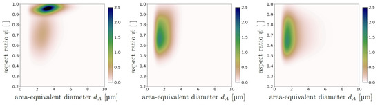 Bivariate distribution of the particle properties of shape, as aspect ratio, and size, as area-equivalent diameter, obtained via the image analysis of glass spheres (left), glass fragments (middle) and magnetite (right). The colour scale is an indication of the frequency of the described property value and has no units.