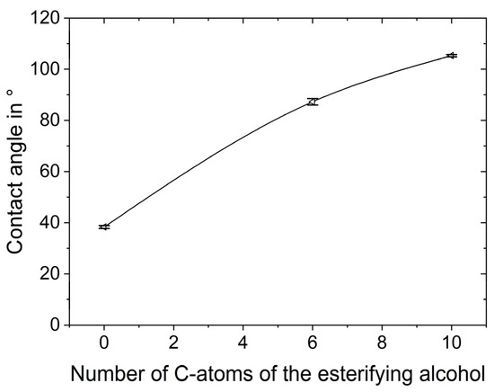 The wettability of the glass particles was modified via an esterification reaction with n-alcohols, where the resulting particle hydrophobicity was controlled via the alkyl chain length of the alcohol used, as shown by Sygusch et al. [30]. In the scope of this study, three different wettability states of glass particles are used for flotation: pristine, unesterified hydrophilic particles (C0), and particles functionalised using the primary alcohols 1-Hexanol (C6, Carl Roth ≥ 98%, used as received) and 1-Decanol (C10, Carl Roth ≥ 99%, used as received) resulting in esterified particles with medium and strong hydrophobicities. The respective contact angles of equally treated glass slides are presented in Figure 3.