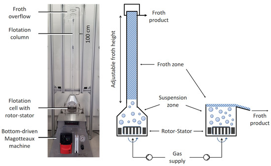A schematic drawing of the MultiDimFlot separation apparatus, which combines mechanical agitator-type froth flotation with column flotation, where the length of the column can be varied, is shown in Figure 4 together with the conventional mechanical froth flotation cell that is used as a benchmark. Both mechanical flotation cells (12 cm × 12 cm) with a rotor-stator system were purchased from Magotteaux, Vaux-sous-Chèvremont, Belgium.